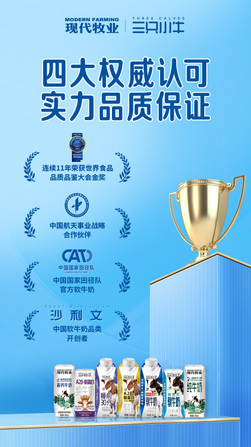 三只小牛深知,不論是品質、口碑或是營銷本就需要一種長期主義的堅守,從連續7年成為中國航天事業戰略合作伙伴、兩屆世界杯官方牛奶、連續11屆榮獲世界食品品質評鑒大會金獎,三只小牛用一次次的實力證明了其產品價值。正是這種長期主義的堅守和對產品品質的執著追求,讓三只小牛贏得了廣大消費者的信賴和喜愛,成為功能牛奶市場的引領者。