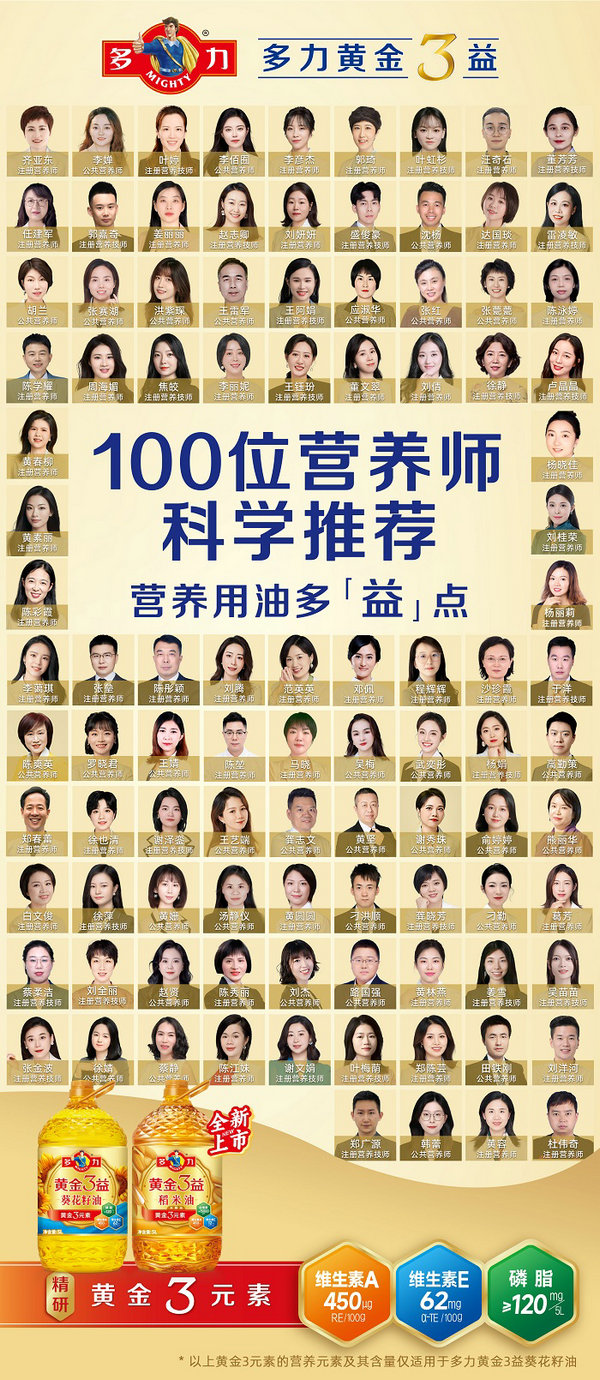 值得一提的是,在6月8日杭州龍湖濱江天街舉行的黃金品牌路演上,多力攜手百位營養師發起倡議,發起了一場營養科普的盛宴,以多力黃金3益品牌開啟“營養用油”新時代,推動食用油產業向營養化再邁新步伐。