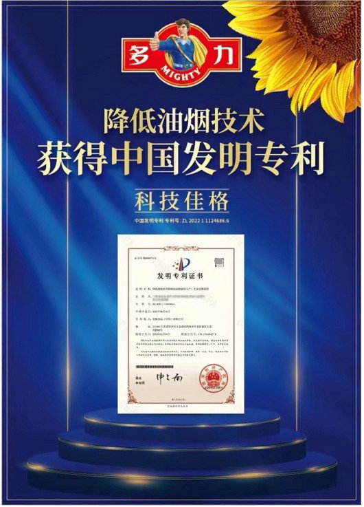 基于長期主義沉淀的堅實研發力,造就了多力的品牌實力。多力獨創的“充氮保鮮”和“七重精煉”工藝技術,讓食用油保留更多營養元素的同時,去除雜質和有害物質。此外,為了解決廚房油煙的難題,多力不斷加碼研發,獨創出“降低精煉食用植物油油煙量的生產工藝及過渡裝置”,榮獲中國發明專利是行業首個降低油煙量發明專利,填補了國內食用油行業相關技術的空白。