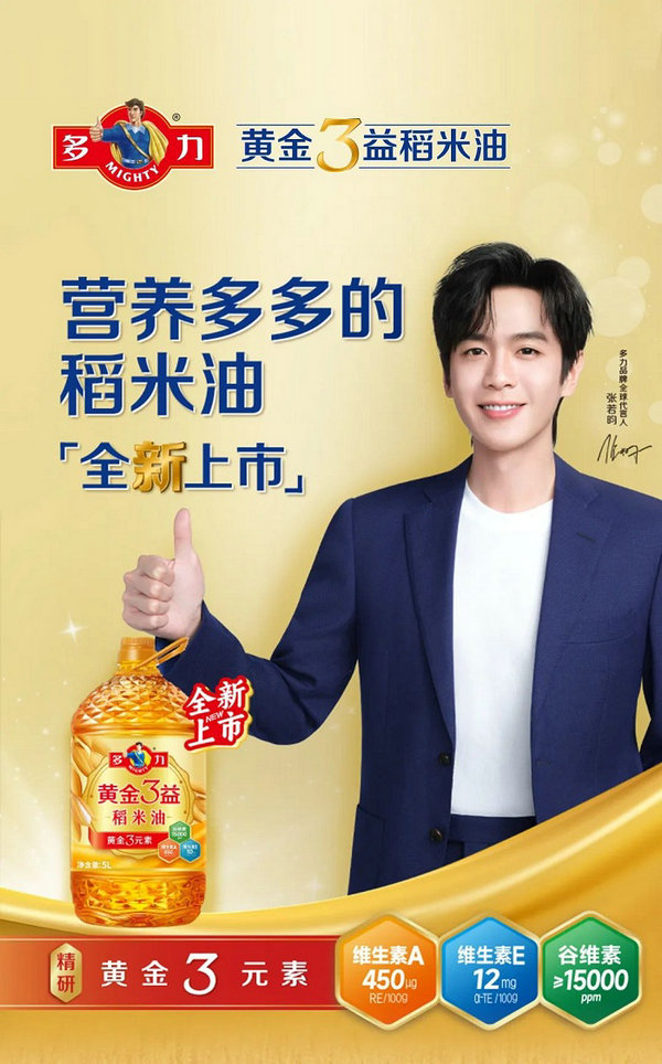 與此同時,簽約實力演員張若昀為多力以及黃金3益品牌代言人,也是多力“品牌驅動”的重要一環。張若昀不斷挑戰多種角色,無論是《慶余年》中的才智雙絕的范閑、《雪中悍刀行》中瀟灑俊逸的徐鳳年和《法醫秦明》里內斂神秘的秦明,都讓觀眾印象深刻。張若昀精琢角色、積極陽光的形象,也與多力21年科技精研,用心做好油,致力于帶來營養好油,健康向上的品牌形象高度契合。也正是因為這樣的“不謀而合”,最終促成了此次張若昀和多力的雙向奔赴,代言人張若昀的加入在為多力品牌發展注入新活力的同時,也將開啟多力黃金3益品牌營養升級的新篇章。