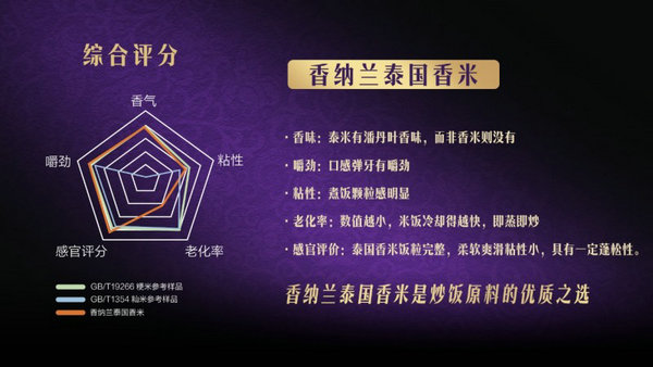 榮譽的獲得并不是空穴來風,而是有著強大的科研數據做支撐。大師賽現場益海嘉里研發中心工程師高明(博士)和中國烹飪協會總廚專業委員會秘書長翟春燕女士現場演繹,揭開了香納蘭泰國香米適合炒飯的奧秘,他們將香納蘭泰國香米與市面上主流粳米和秈米從香味、米飯粘性、老化率、彈性、食味值五大維度進行比較發現,香納蘭泰國香米在炒飯品類勝出,成為五星總廚炒飯優選大米。高明博士表示,益海嘉里一直專注國人飲食健康,致力于傳播健康飲食文化。以此次炒飯大師賽為契機,益海嘉里將繼續在產品端不斷創新,推出更健康、更營養、更安全、符合消費需求的產品。
