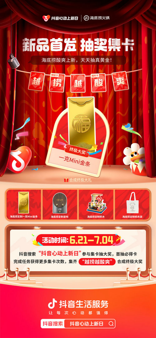 配合官方直播,「抖音心動上新日」還與海底撈聯動打造了多重線上社交玩法,讓這個夏天一“撈”永逸的重頭戲當屬集卡抽獎任務,每完成一次平臺設定的“送分型”任務,就能獲得一次抽卡機會,集齊“越”“撈”“越”“酸”“爽”5張卡面就可兌換神秘終極大獎。集卡過程中還有海底撈定制音響、場景積木、帆布袋等驚喜隨機掉落?焐稀付兑粜膭由闲氯铡箷䦂鲇訉儆谀愕摹靶⌒疫\”吧!