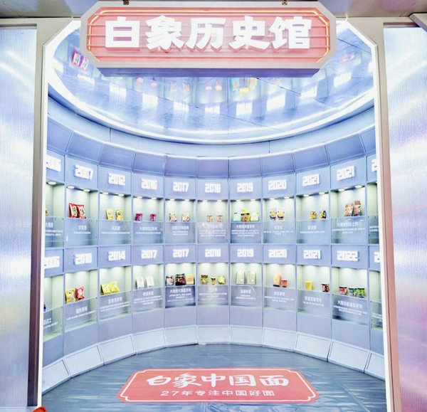 “白象歷史館”則采用270°沉浸式環繞設計,展示白象27年來的經典產品:湯好喝老母雞湯面、白象大辣嬌麻辣小龍蝦拌面、白象大辣嬌火鍋面、蟹黃面和香菜面等等。白象的產品創新,從未停止!