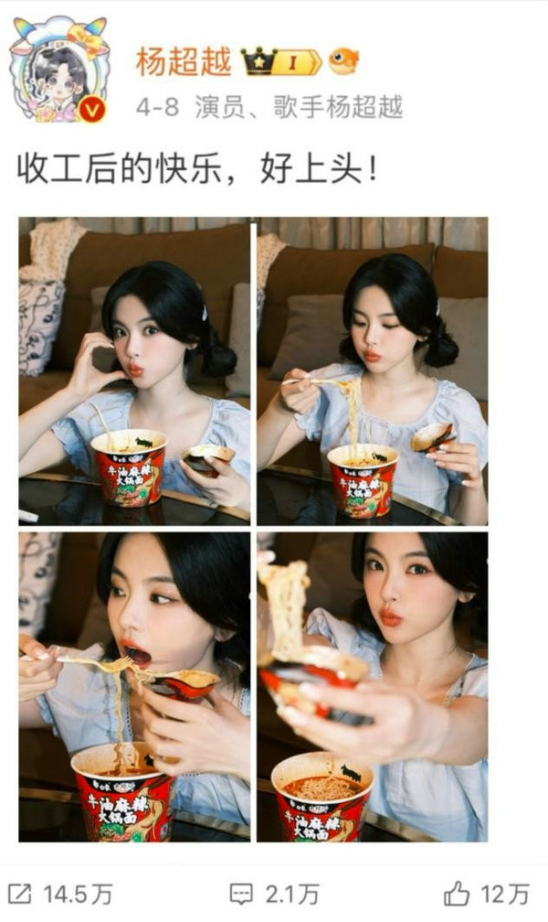 在抖音、微博、小紅書等社交媒體平臺,圍繞這款火鍋味泡面的話題“00后的火鍋平替”“火鍋味泡面的100種搭法”,超過5億次播放/瀏覽,用戶參與其中與品牌深度互動。而國民青春偶像楊超越也是其中的一員,在微博上直呼“收工后的快樂,好上頭!”。