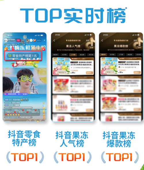 值得注意的是,直播過程中,時代少年團還隆重介紹了溜溜梅梅凍夏季限定新品,在新品梅凍功效、味道等因素吸引下,大家紛紛加入搶購的隊伍中;直播1小時,僅新品銷量就達到了320萬+,位列《抖音果凍人氣榜》與《抖音果凍爆款榜》TOP1,梅凍也成為了《抖音零食特產榜》冠軍,可謂是實現聲量與銷量的“雙豐收”。
