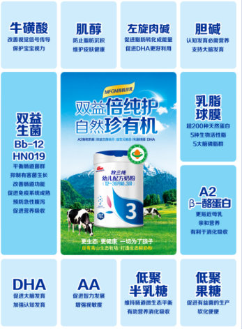 同時,明一牧蘭純奶粉作為首款MFGM有機珍乳,其富含乳脂球膜(MFGM)成分,這種成分蘊藏著豐富的生物活性物質,包括5種生物活性脂、超過200種的天然蛋白,以及5大腦磷脂群,對嬰幼兒神經發育和功能、認知、行為、免疫預防等方面均發揮著積極的作用。