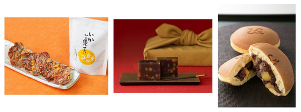 日式點心區您可以感受到日本的“傳統”和“美感”,有傳統方法制作的銅鑼燒和羊羹,也有活用食材且制作方法新意十足的水果大福和仙貝等,各種各樣一應俱全。其中推薦的是“越前海鮮俱樂部”炸魷魚仙貝 50g(如圖左),咀嚼時魷魚的鮮美味道會在口中充分散開,在酒店當夜宵點心也很適合!還有“鶴屋吉信”栗子羊羹(如圖中)、“鶴屋八幡”栗子舞鶴(如圖右)等秋季限定的栗子口味日式點心都將陸續登場。羊羹保質期比較長,很適合作伴手禮!