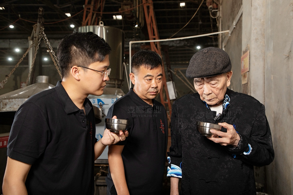張支云與家族傳承人在支云酒莊品鑒基酒品質(左起:支云酒業董事長張煬、總工程師張富強、靈魂創始人張支云)