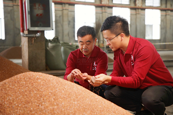 2023年下沙季,張支云釀酒技法傳承人張富強、張煬深入生產一線,檢查釀酒用高粱的品質