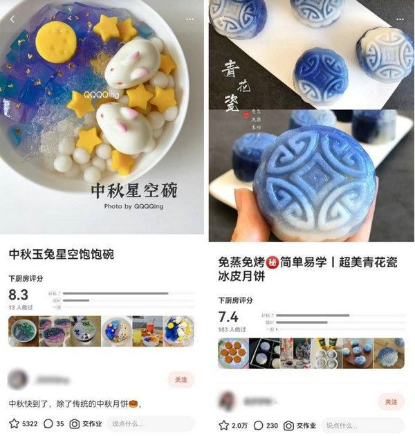 選定食譜后,打開《叮咚買菜》。糯米粉、粘米粉、黃油、豆沙……制作玉兔冰皮月餅的食材一站式加購。這里還提供了豐富又新鮮的應季時蔬,配合《下廚房》里的菜譜,不出家門即可做一桌佳肴!