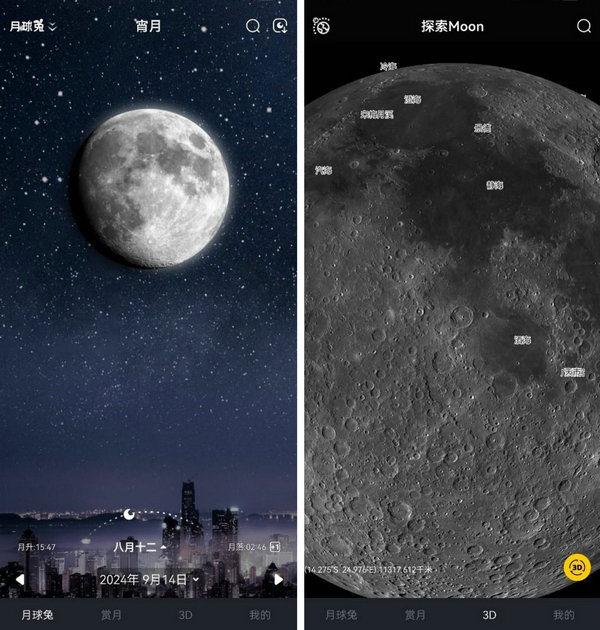 傍晚時分,使用《日出日落月相》,精準預測并追尋一天中最珍貴的“藍調時刻”,也可借此找到中秋之夜的圓月最佳觀賞時間和位置。而《Moon月球》的AR與VR功能,則讓賞月體驗更上一層樓。在明月高掛的夜晚,使用《Moon月球》AR功能觀星賞月,飛往宇宙觀賞月圓的浪漫;打開VR探索太空,在家享受太空漫步的奇妙感受。