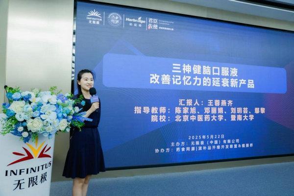 北京中醫藥大學中醫診斷學 博士研究生王蓉燕齊帶來了【基于三神散的新產品研發】的項目分享,她表示,項目誕生于腦健康、延衰市場不斷增長的背景下,源自經典名方,團隊通過將三神散與功能因子相結合,針對記憶力方向,并進行了實驗驗證。通過現代化的工藝,讓產品的濃度更高、口味更好。