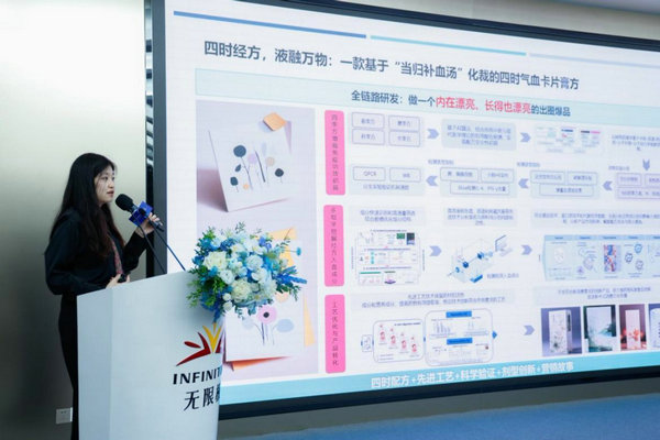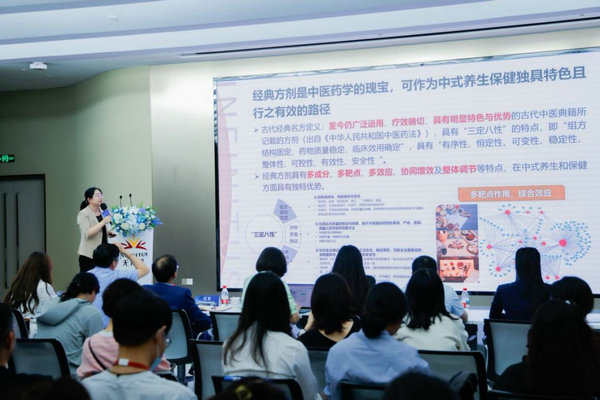 活動最后,無限極(中國)有限公司前沿技術研究經理趙宏偉帶來《經典方劑在大健康產品中的現代化應用研究》主題分享。她深入剖析經典方劑在大健康領域的發展機遇與現代化路徑,結合無限極實踐,分享經典方劑在養生保健健康食品中的應用案例與研究成果。